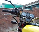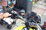 5.Picture showing the set up of the leftside handlebar. Thumb brake nestles under the throttle and clutch. Indicators are operated by a toggle switch reachable via the index finger.